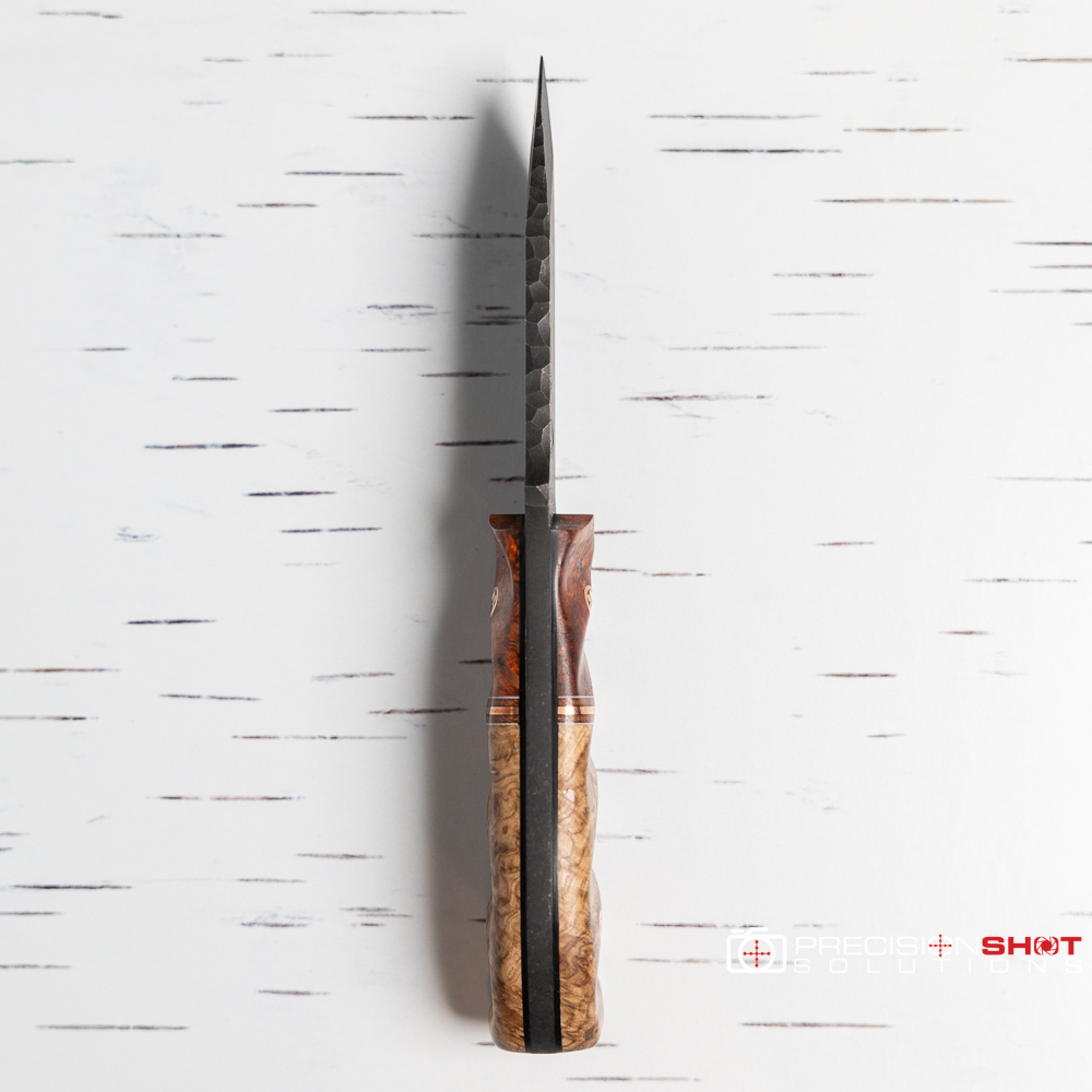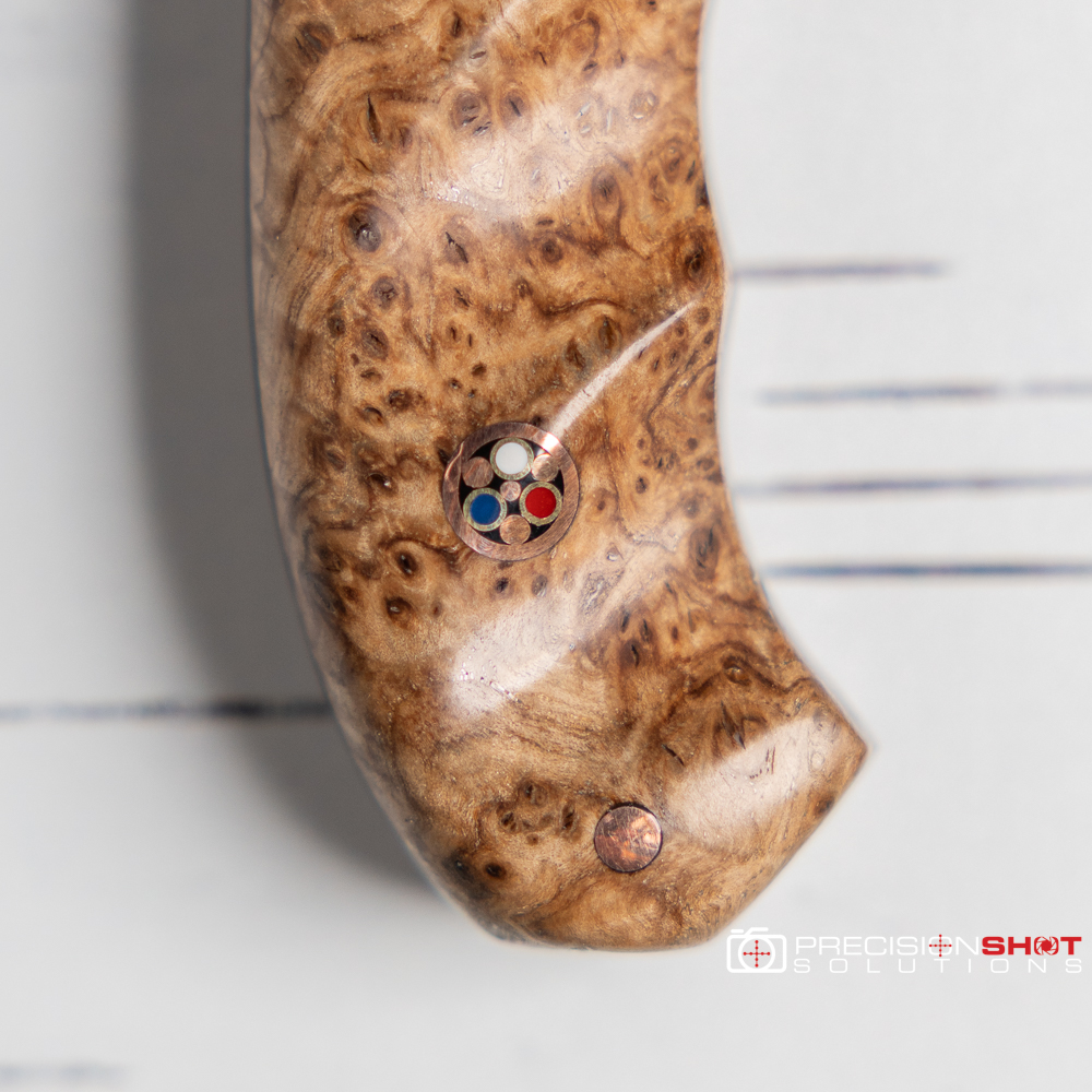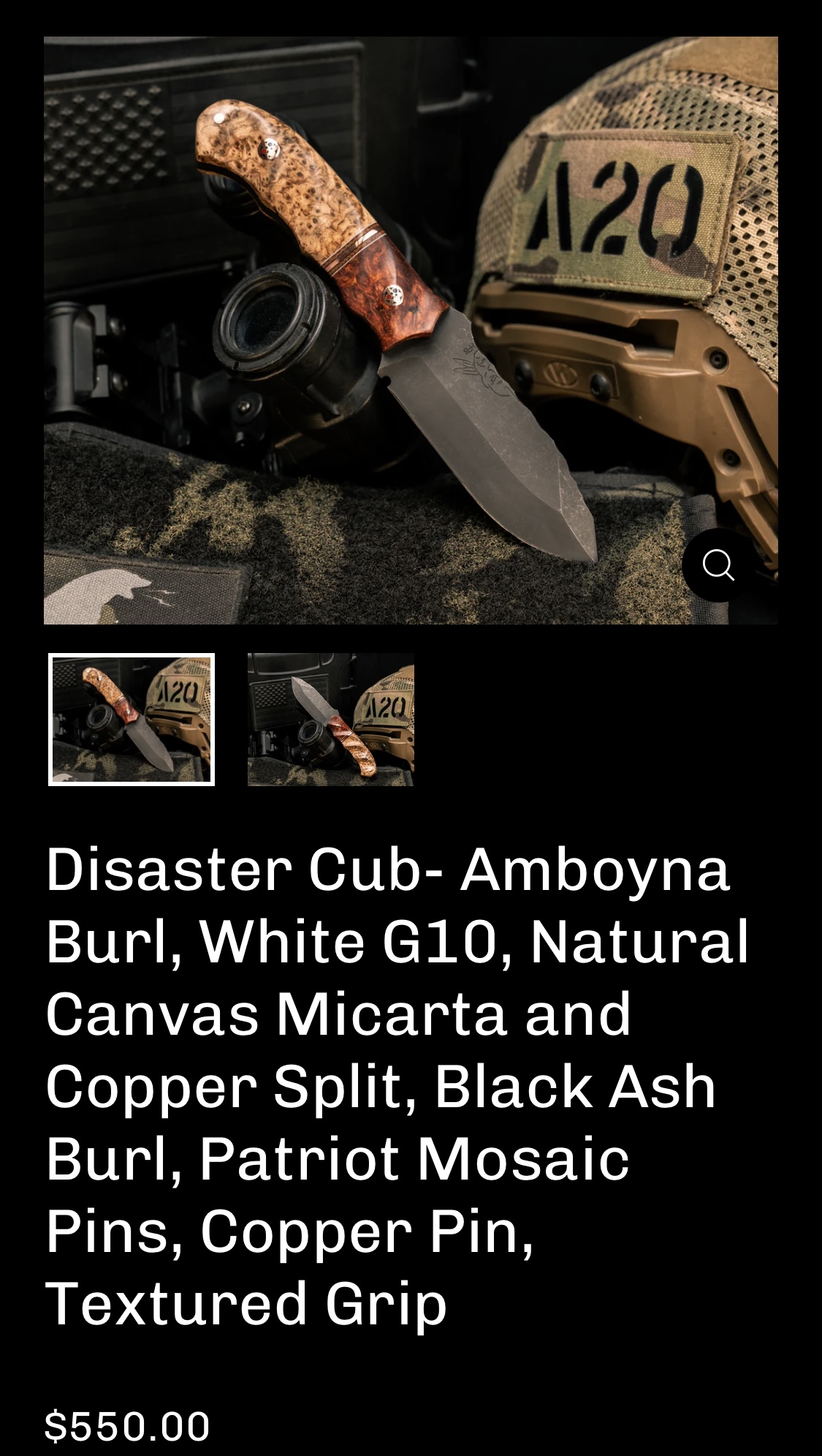 Half Face Blades Disaster Cub, Amboyna burl/white G10, natural canvas micarta, and copper split/black ash burl, Patriot pins, Copper mini pin
