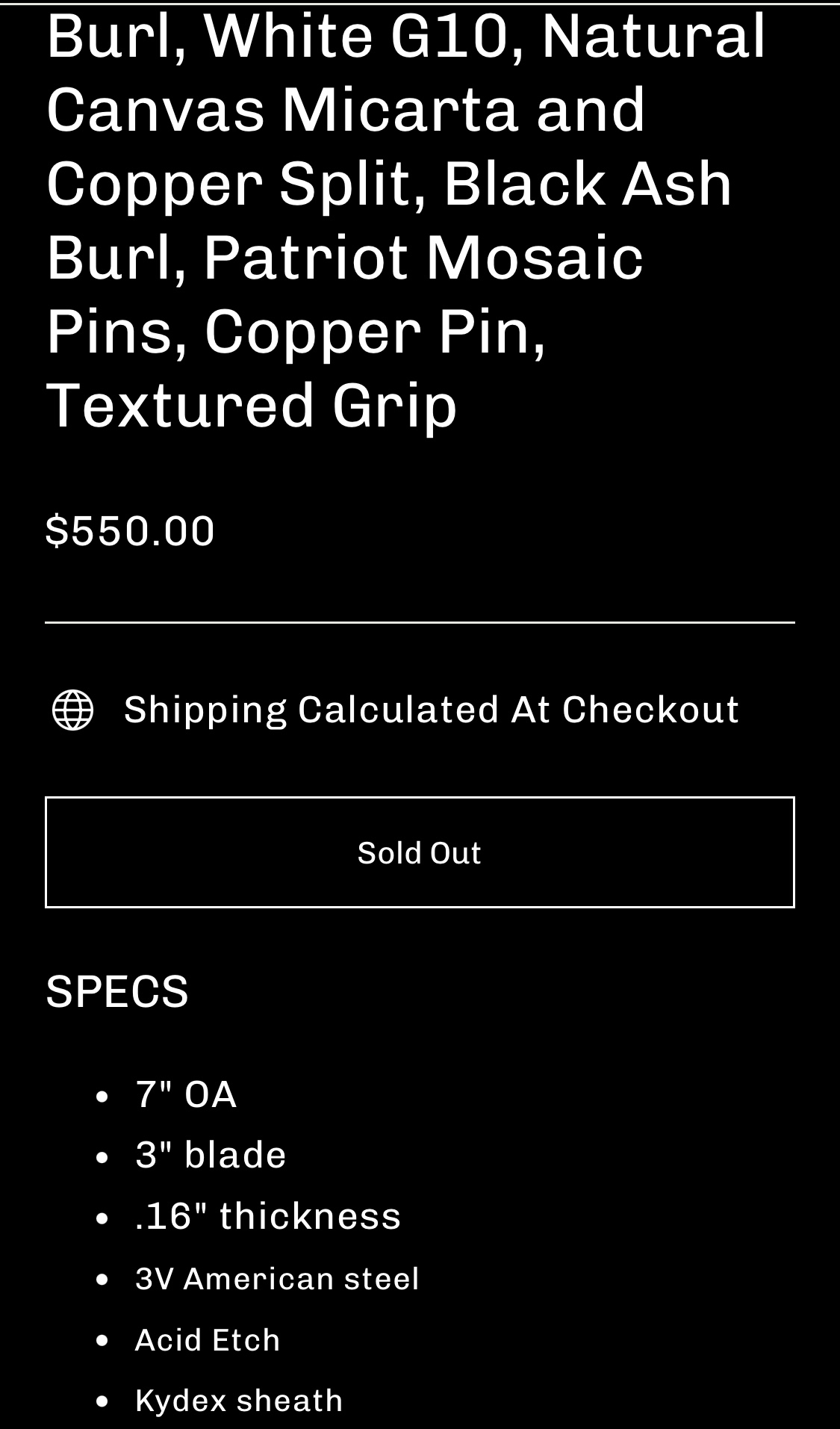 - 3V American steel, acid etched