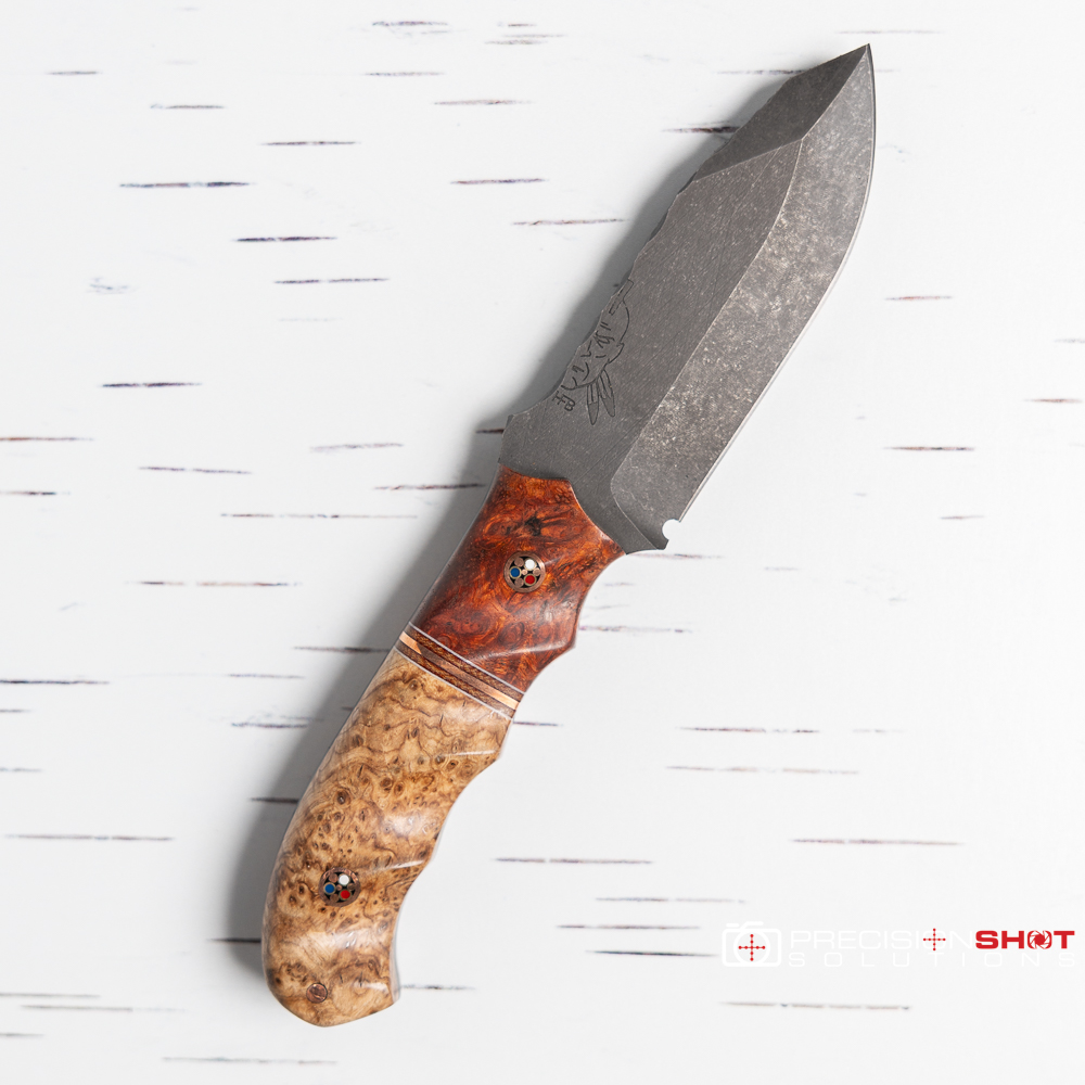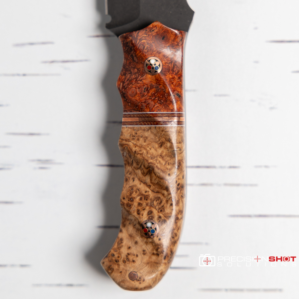 Half Face Blades Disaster Cub fixed blade knife featuring Amboyna burl/white G10, Natural canvas micarta, and copper split/black ash burl handles with textured grip, patriot mosaic pins, and a mini copper pin. Comes with black kydex sheath with metal belt clip.