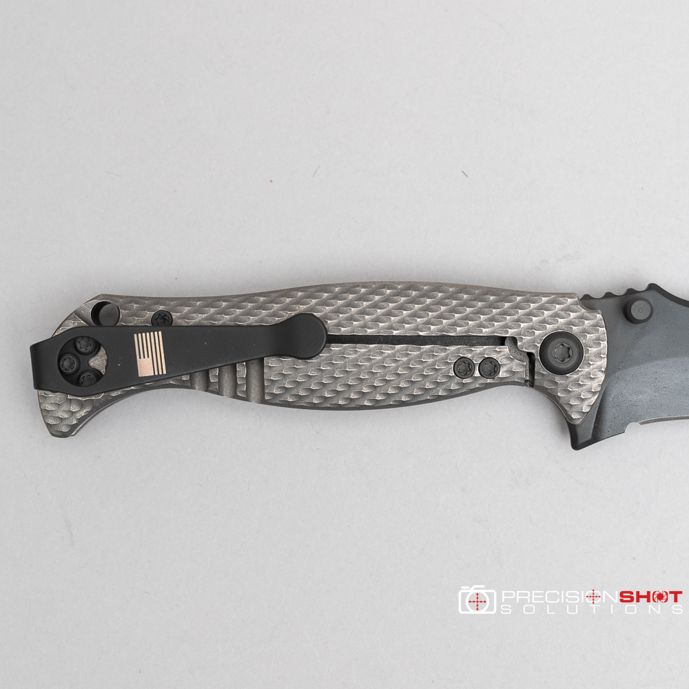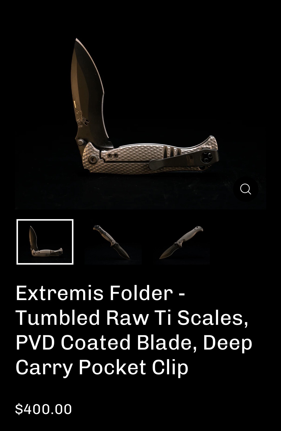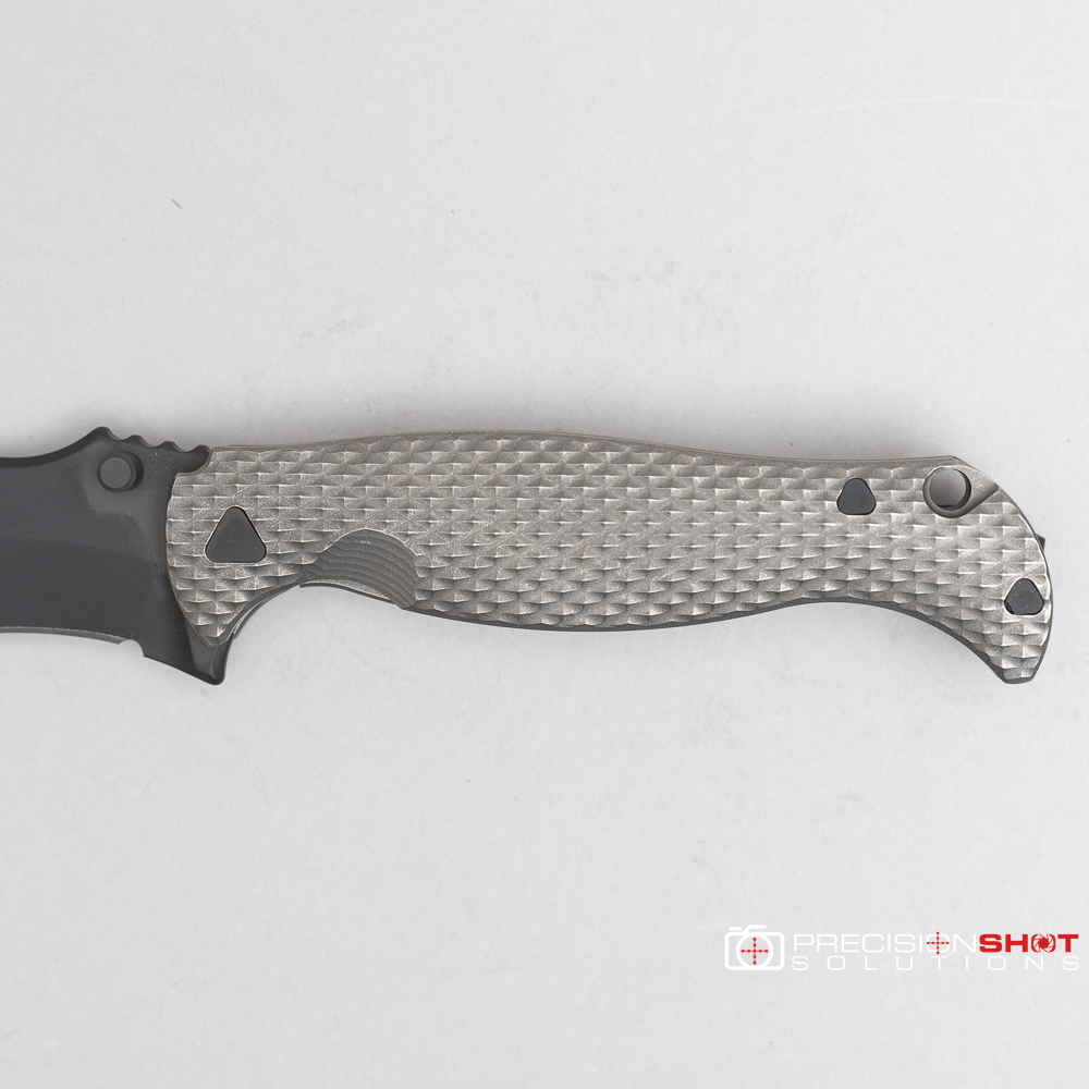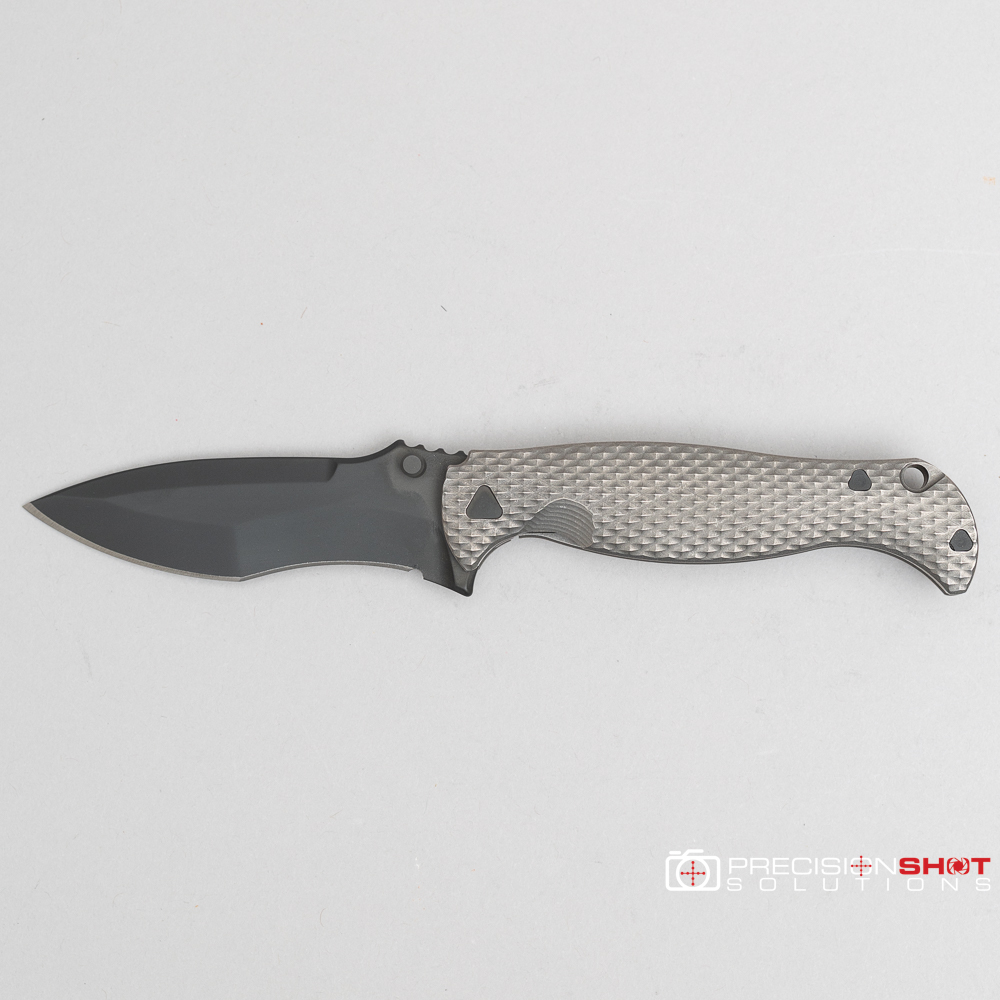 This is the Half Face Blades Extremis folder with tumbled raw titanium scales, black PVD coated blade, and deep carry pocket clip.