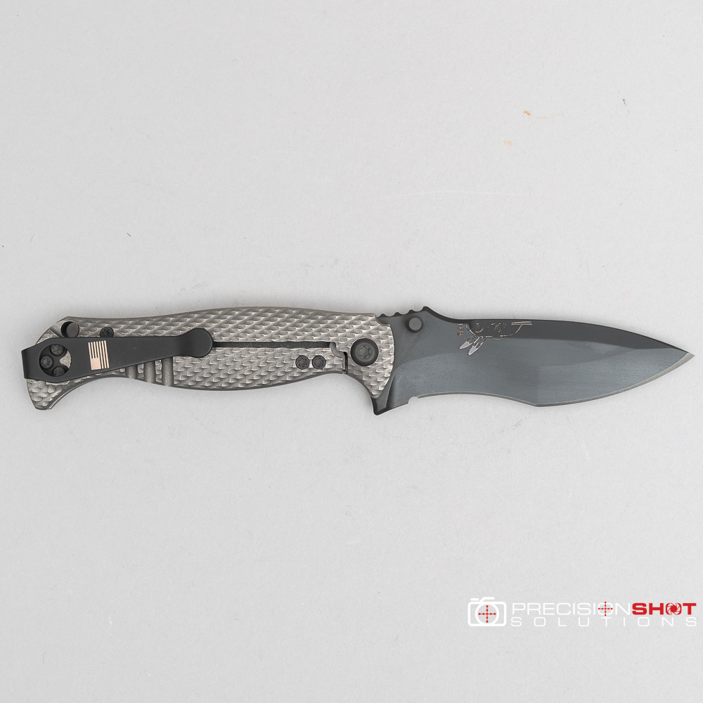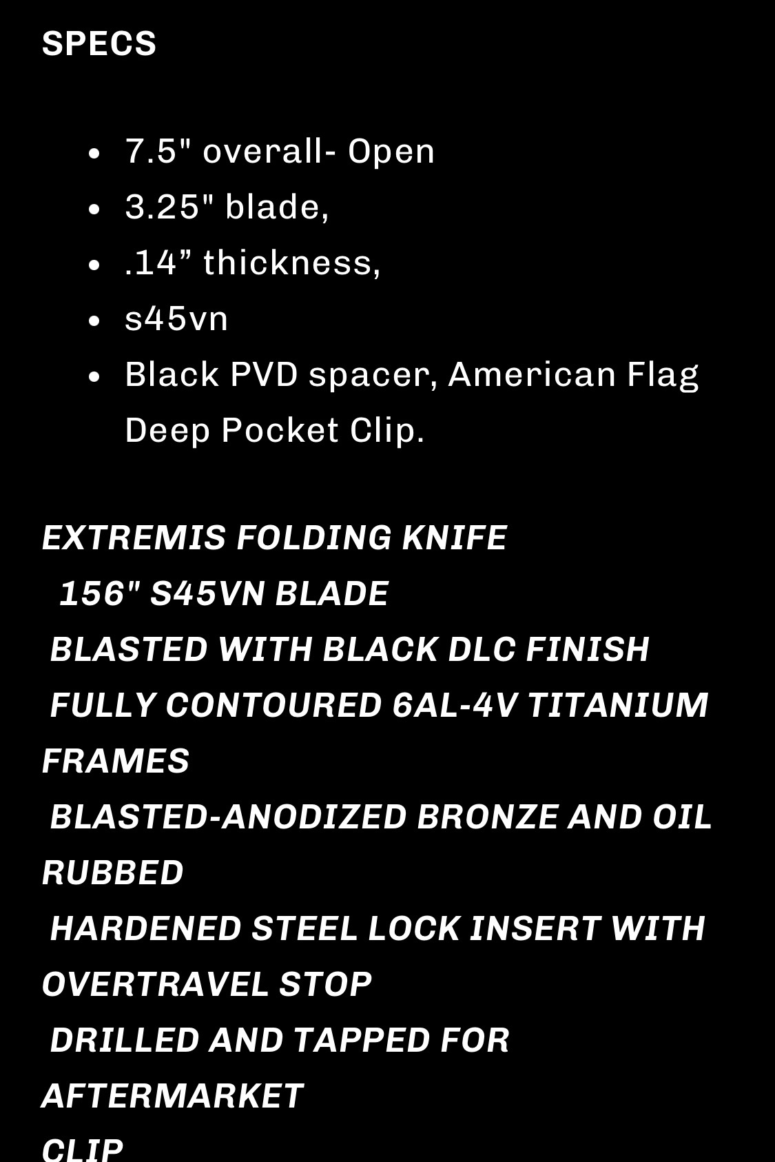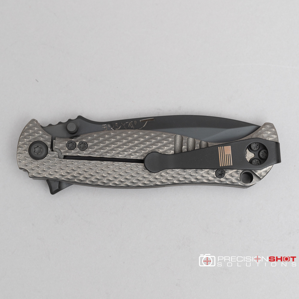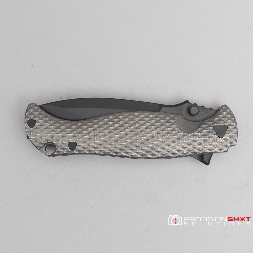 This is the Half Face Blades Extremis folder with tumbled raw titanium scales, black PVD coated blade, and deep carry pocket clip.
