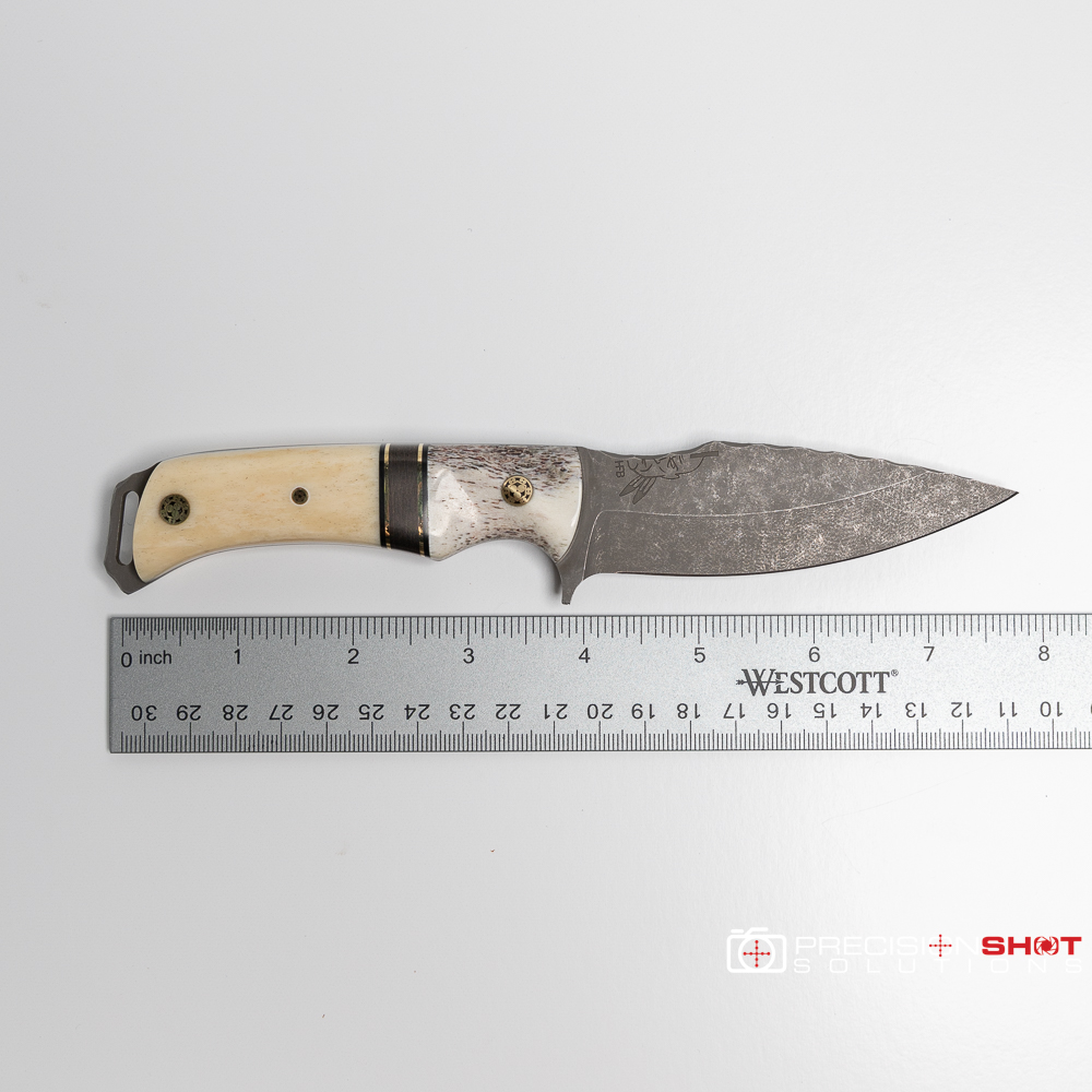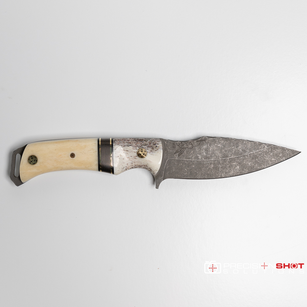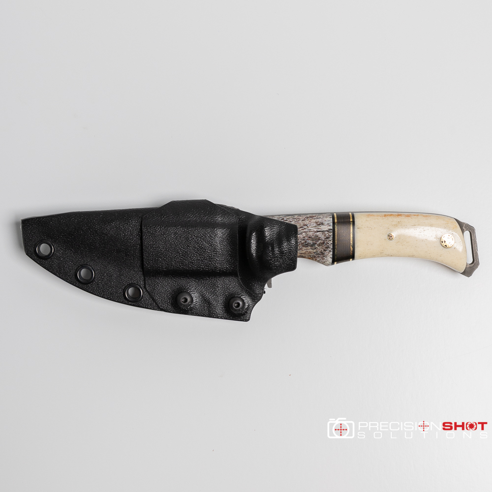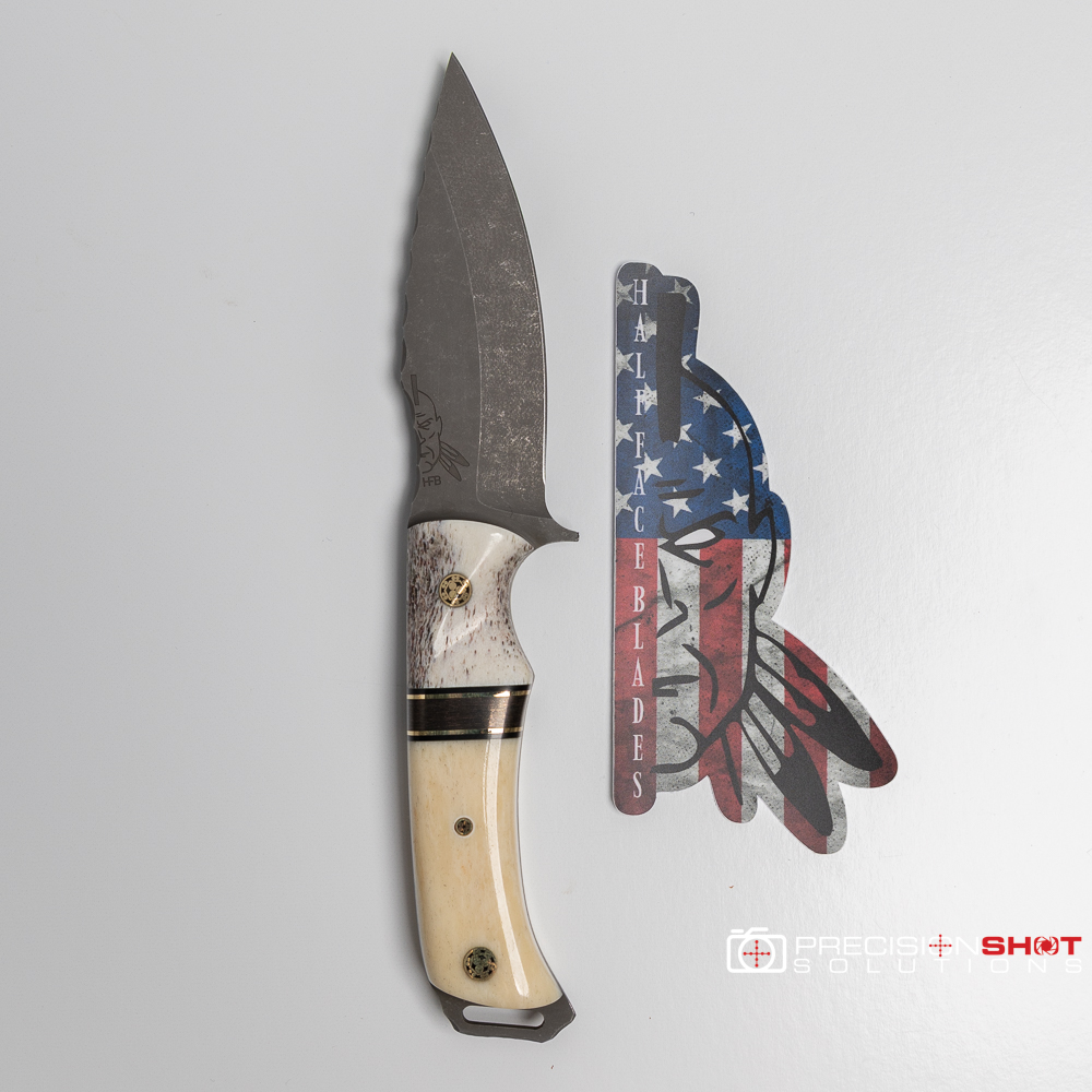 This Ishi by Half Face Blades features a unique set of elk antler handles with “dirty” elk closest to the blade, brass and G10 pin striping with a brass infused carbon split, and then “clean” elk near the tang. It has mosaic pins with a bonus mini pin and exposed tang. Comes with white suede lined kydex sheath.