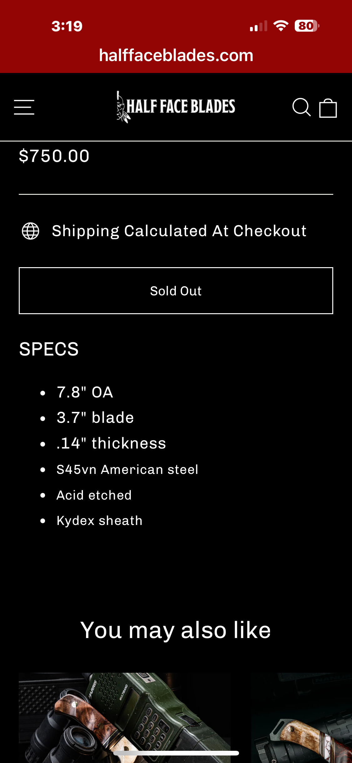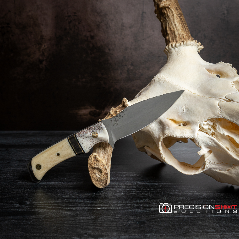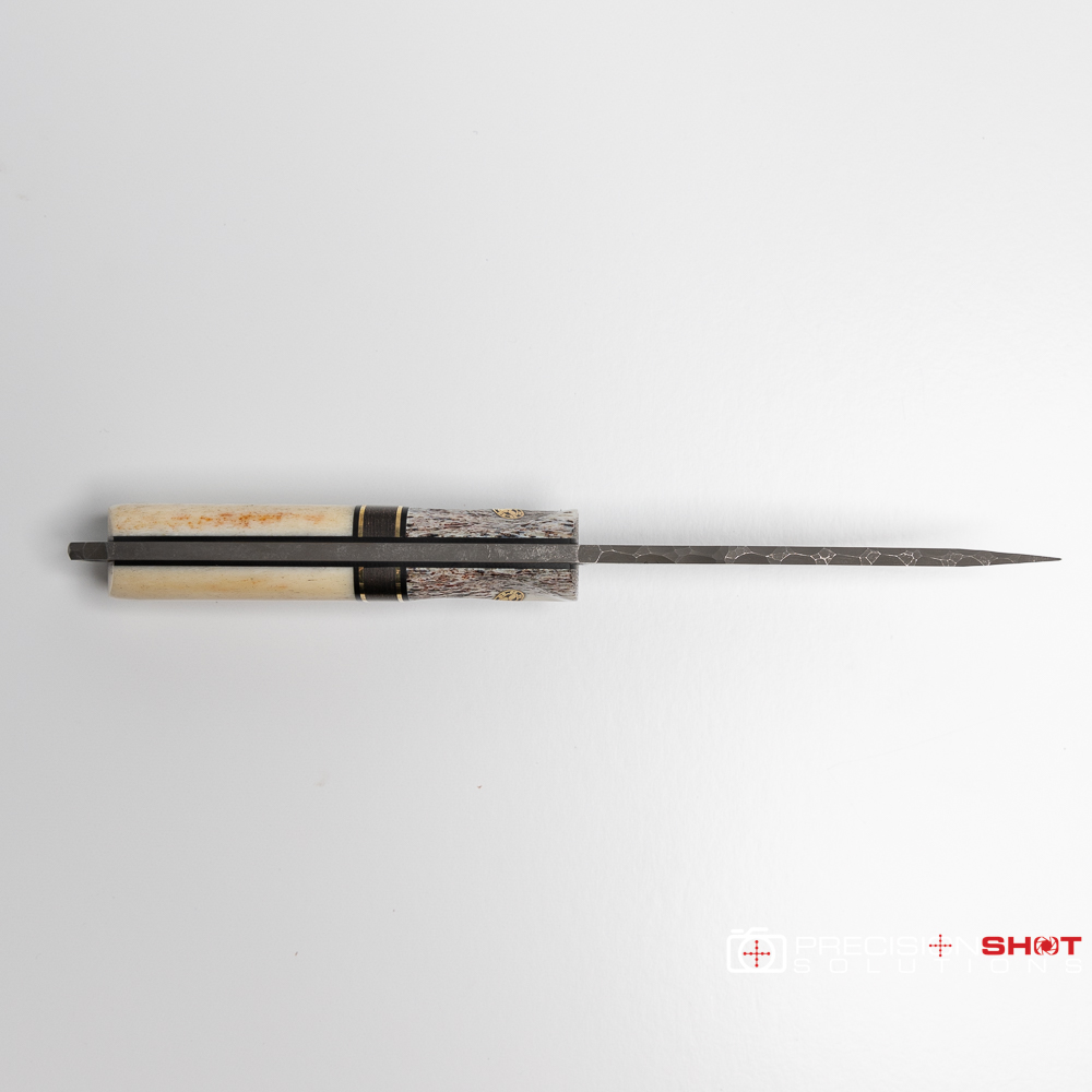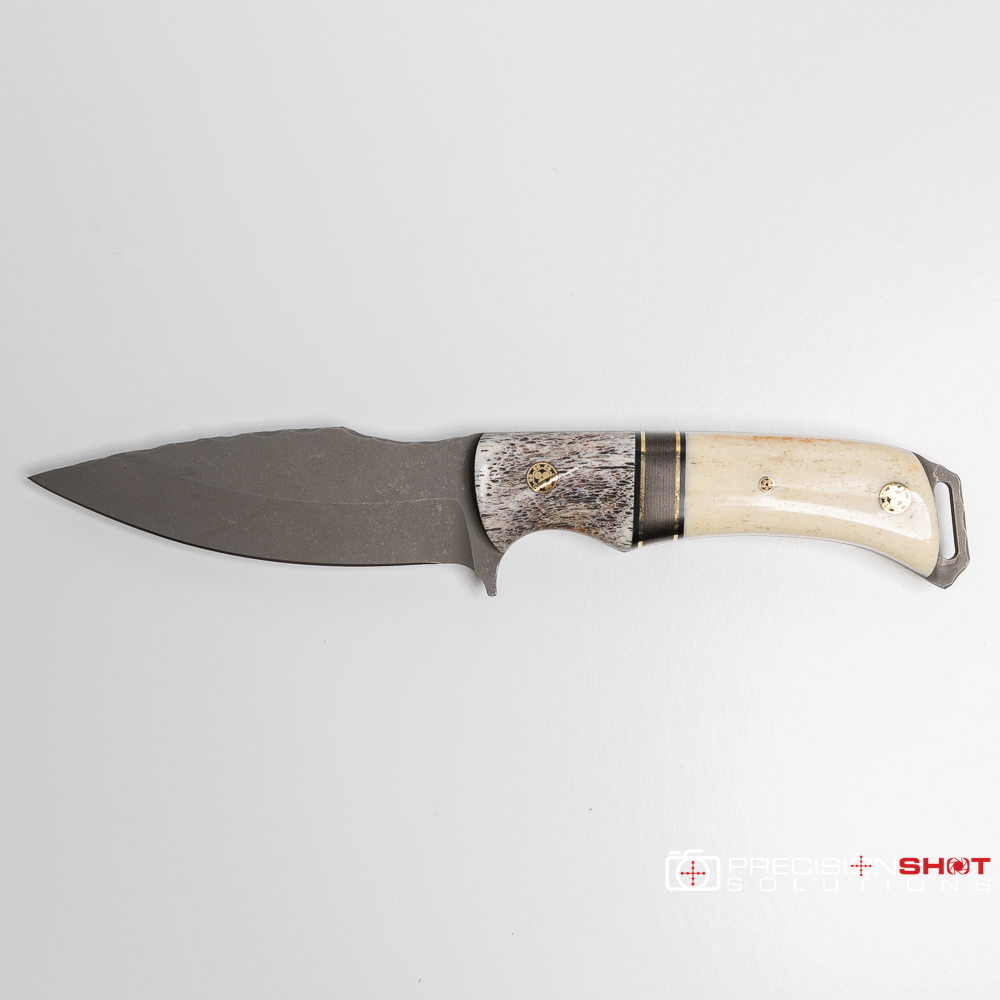 This Ishi by Half Face Blades features a unique set of elk antler handles with “dirty” elk closest to the blade, brass and G10 pin striping with a brass infused carbon split, and then “clean” elk near the tang. It has mosaic pins with a bonus mini pin and exposed tang. Comes with white suede lined kydex sheath.