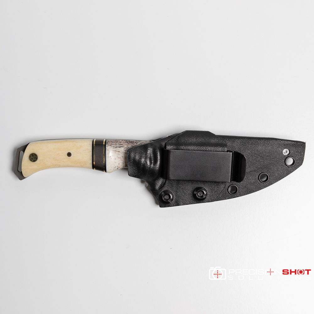 - White suede (won’t stain the elk handle) lined black kydex sheath