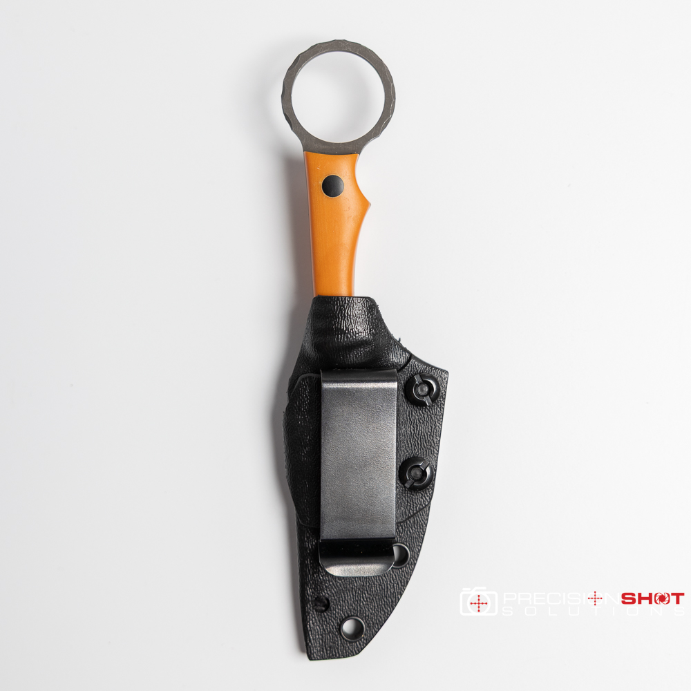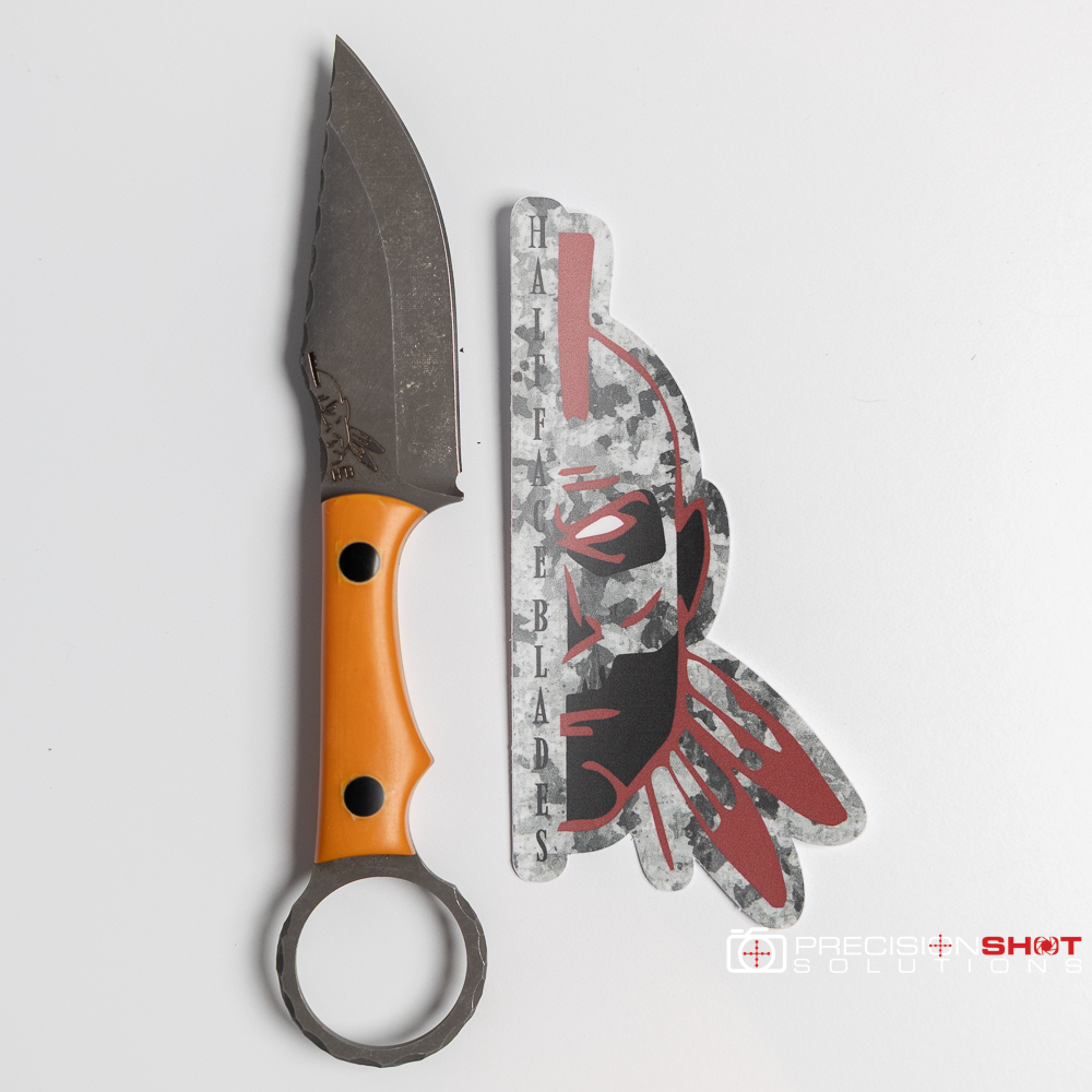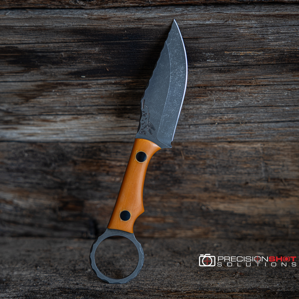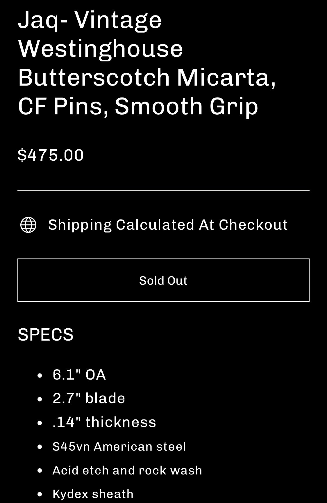 Half Face Blades Jaq featuring vintage Westinghouse butterscotch micarta, carbon fiber pins, and smooth grip. Comes with black kydex sheath.