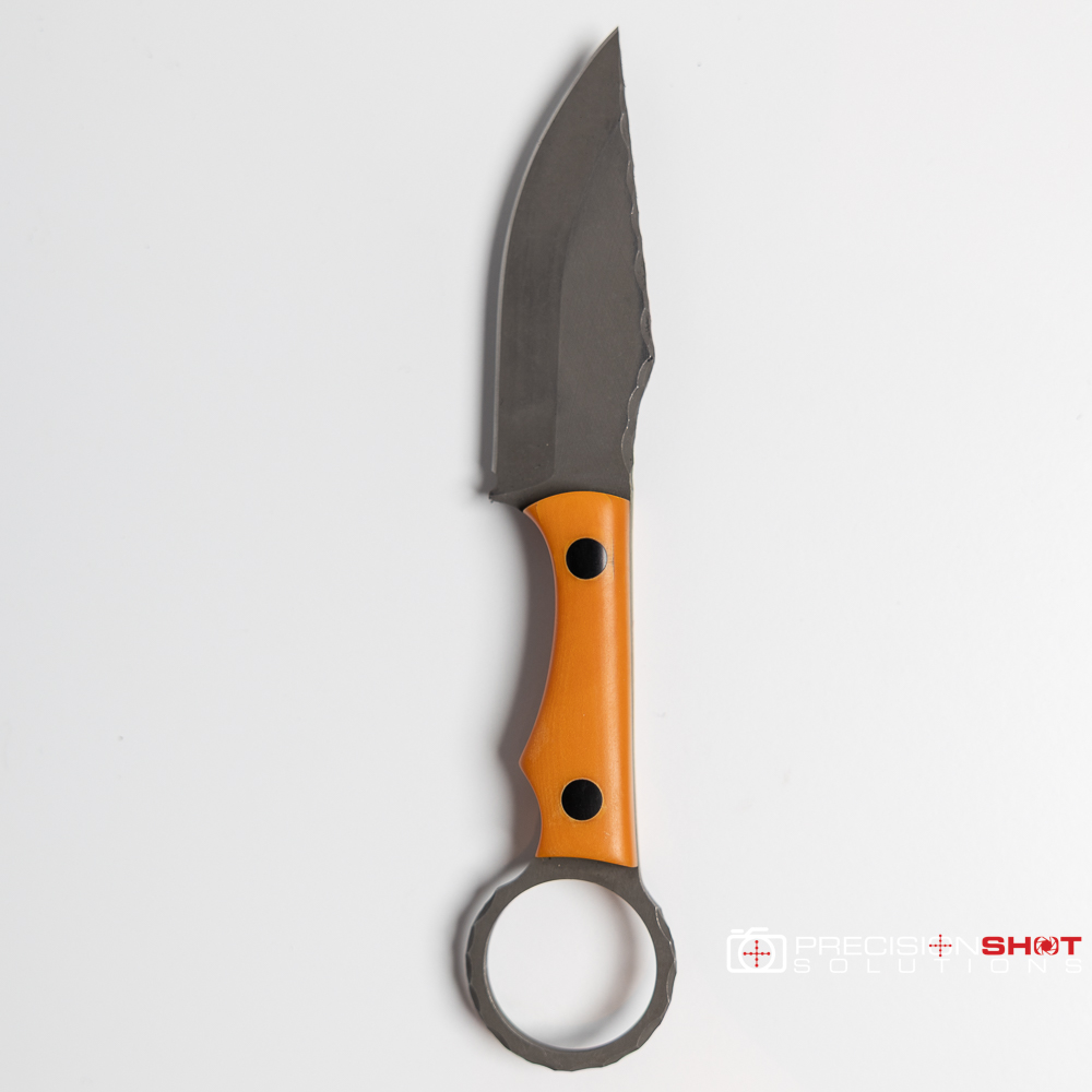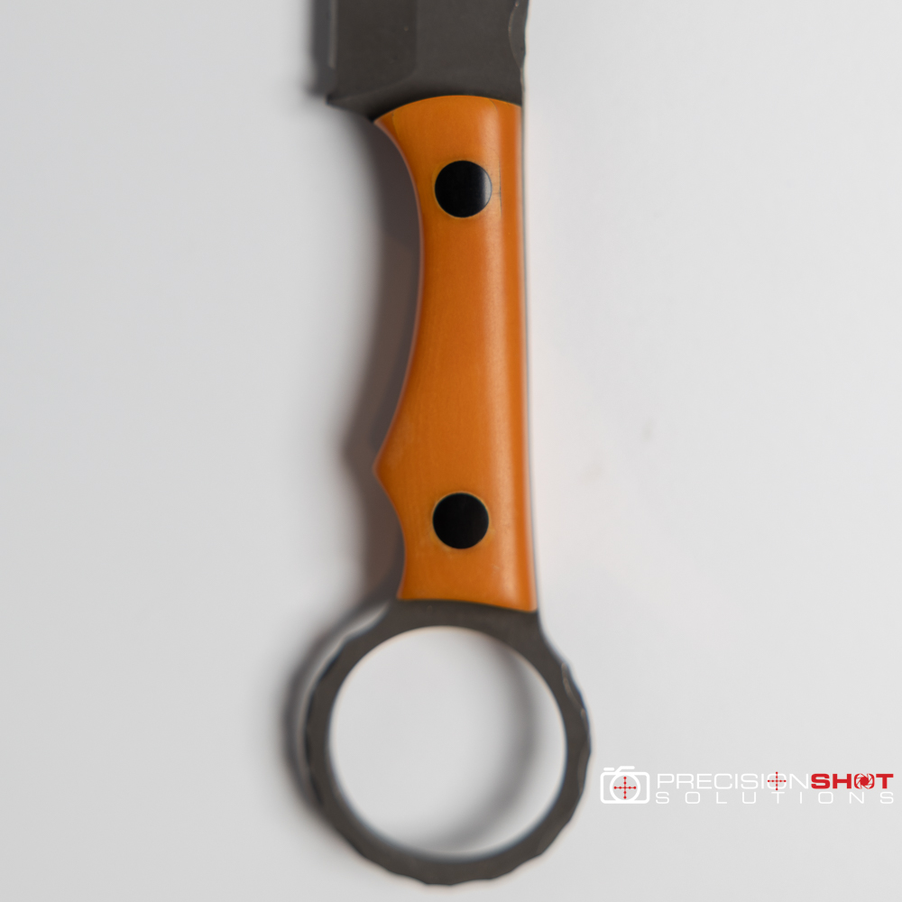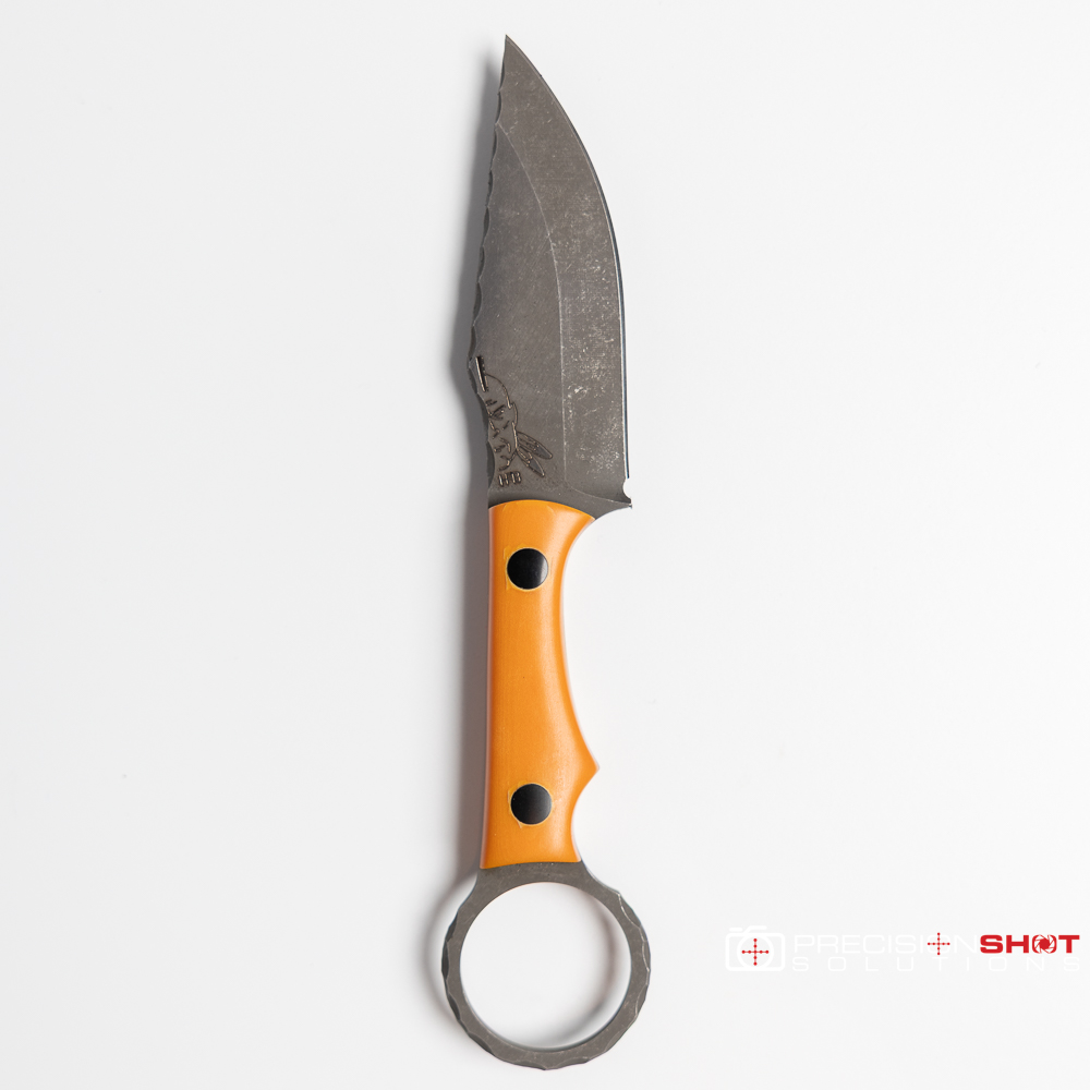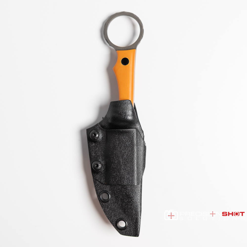 Half Face Blades Jaq featuring vintage Westinghouse butterscotch micarta, carbon fiber pins, and smooth grip. Comes with black kydex sheath.