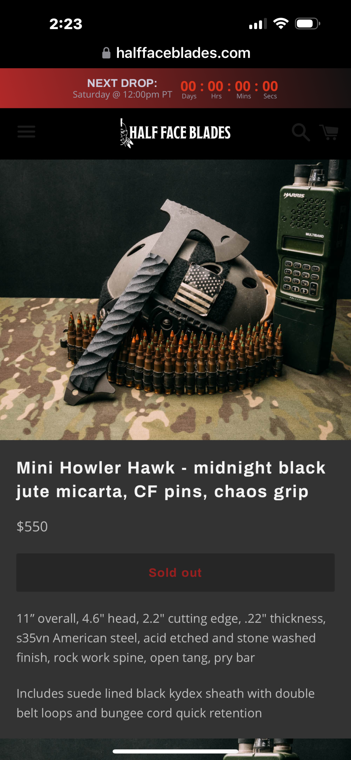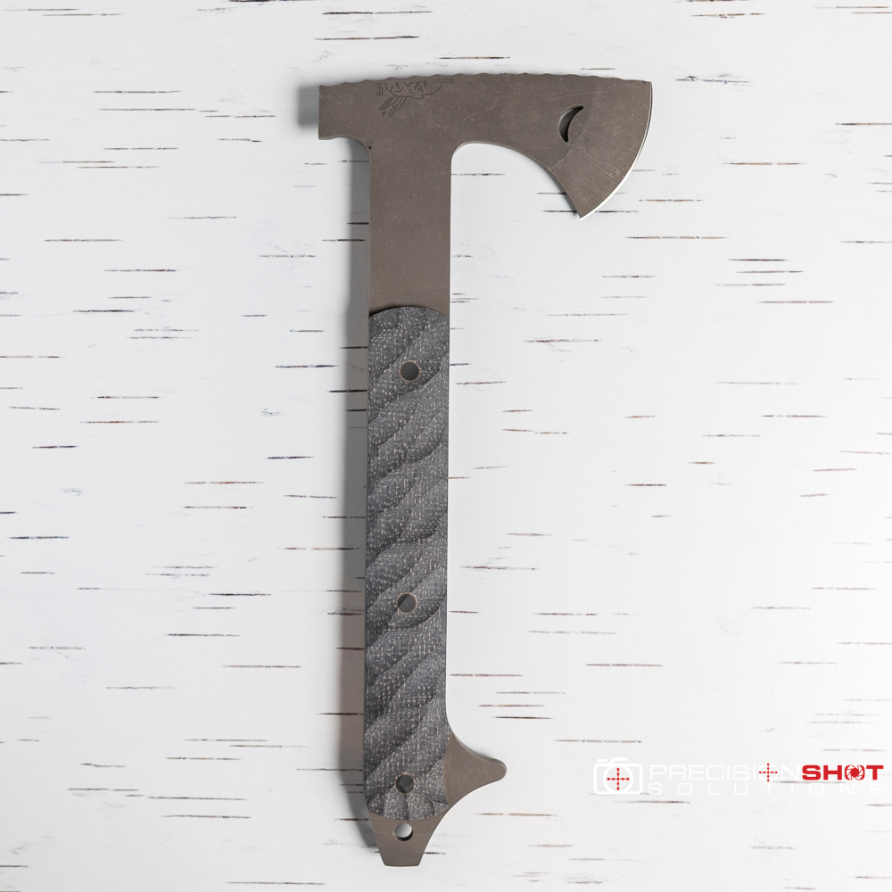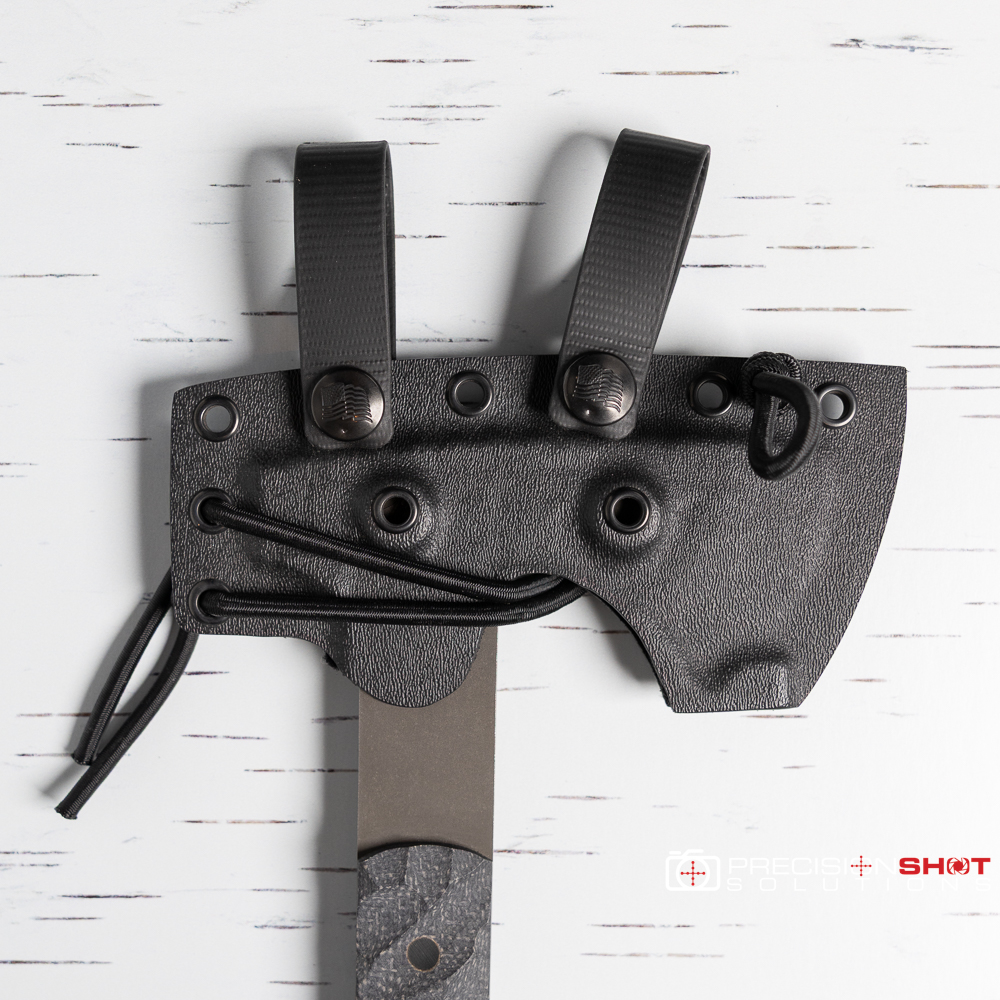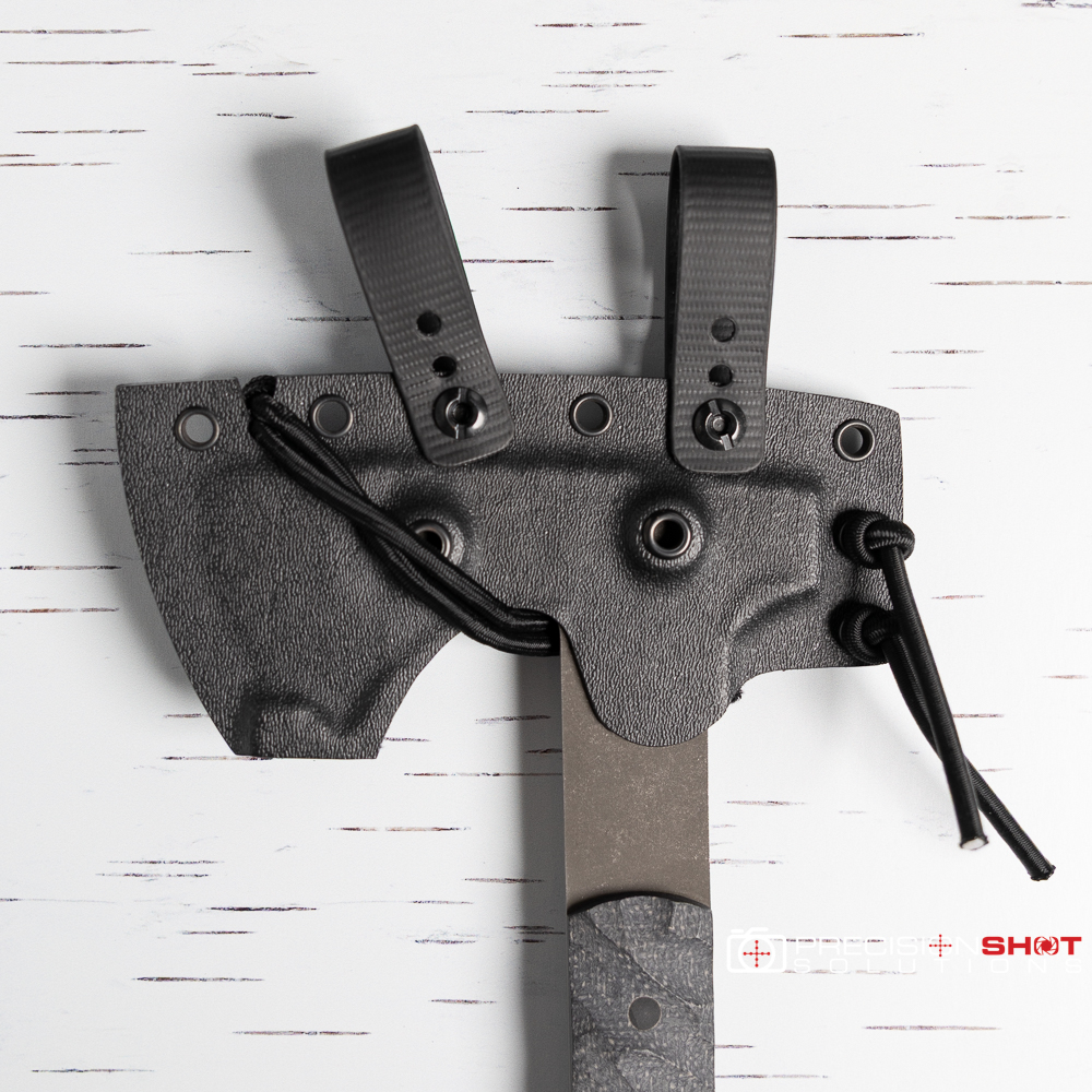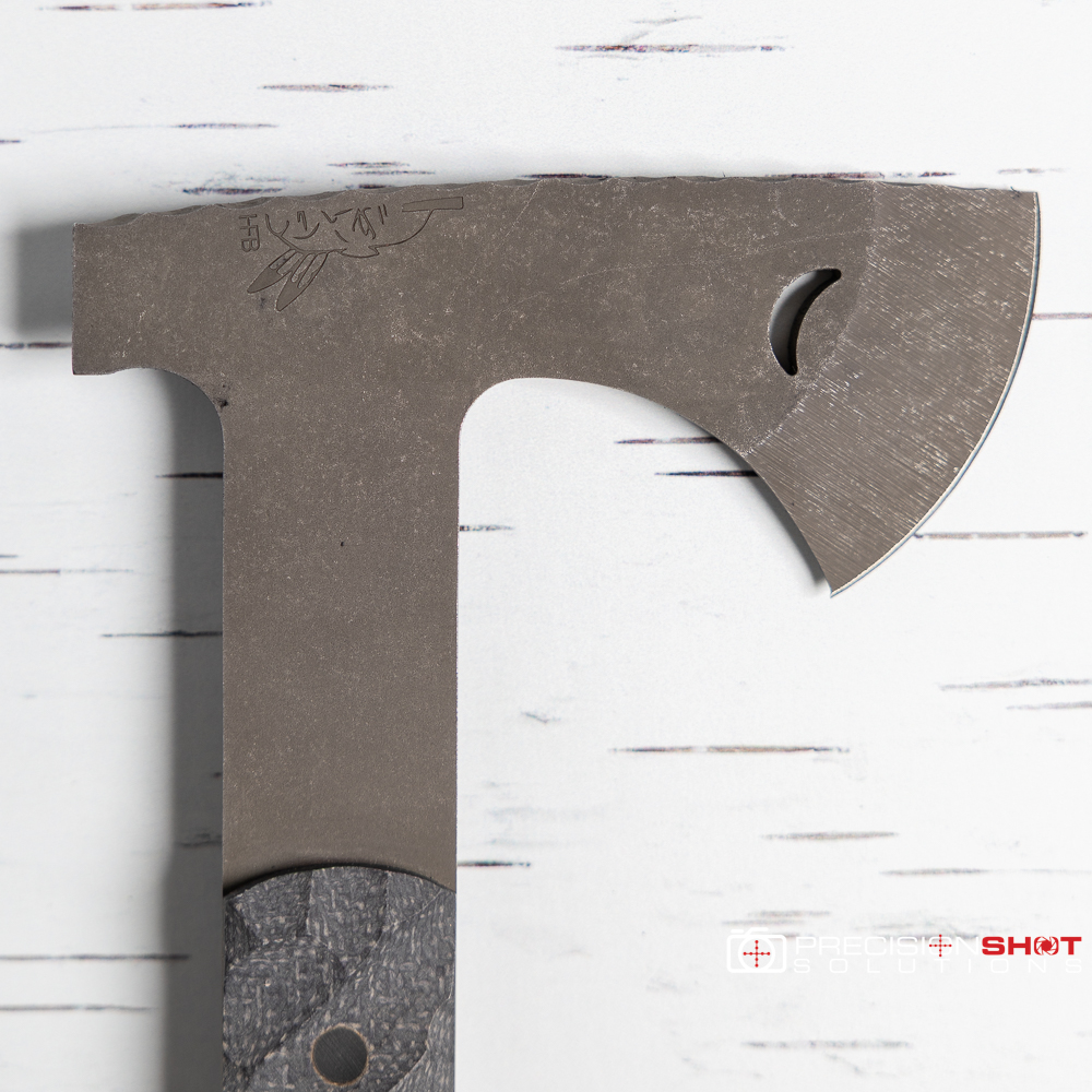 Half Face Blades Mini Howler Tomahawk featuring midnight black jute micarta handles with chaos grip, carbon fiber pins. Comes with suede lined black kydex sheath with double belt loops and bungee cord quick retention. I purchased this hawk on the 8/10/24 drop and it is in like-new and unused condition.