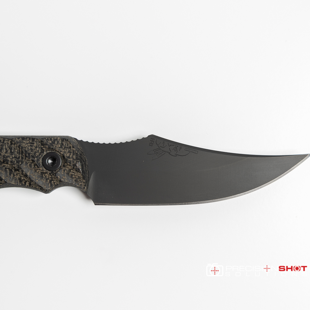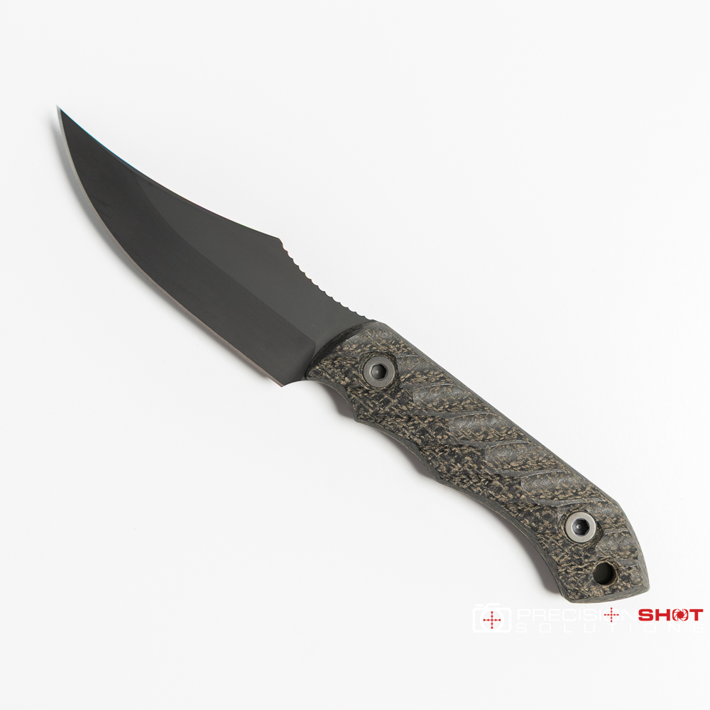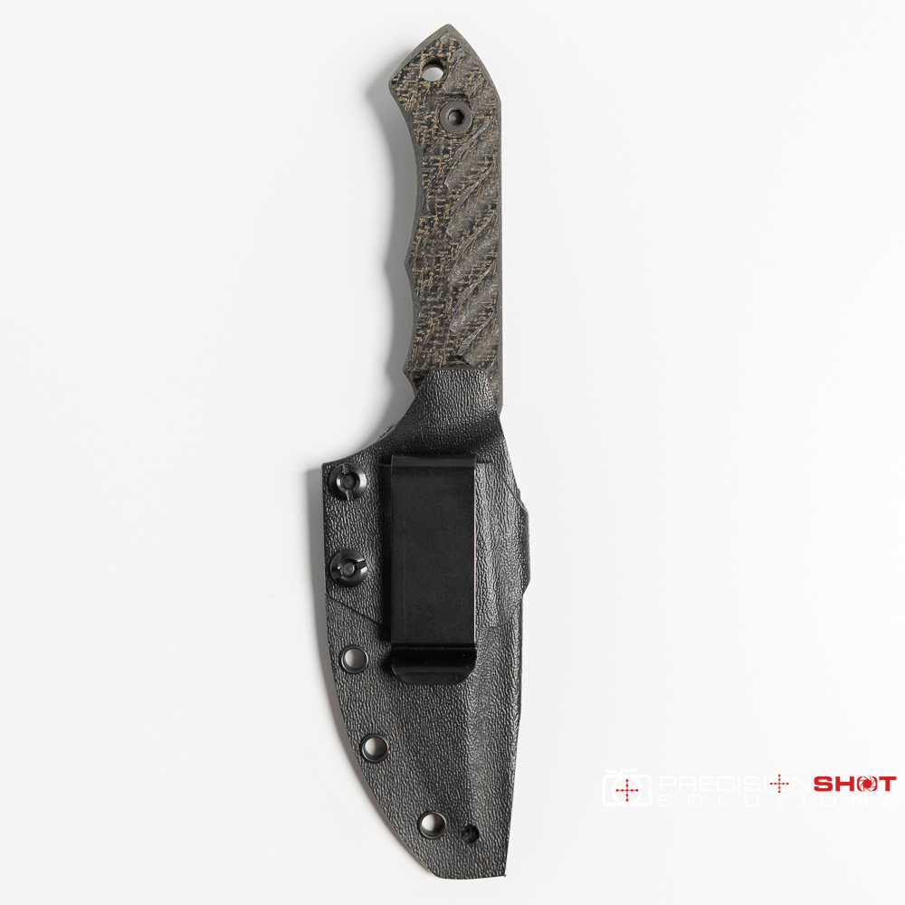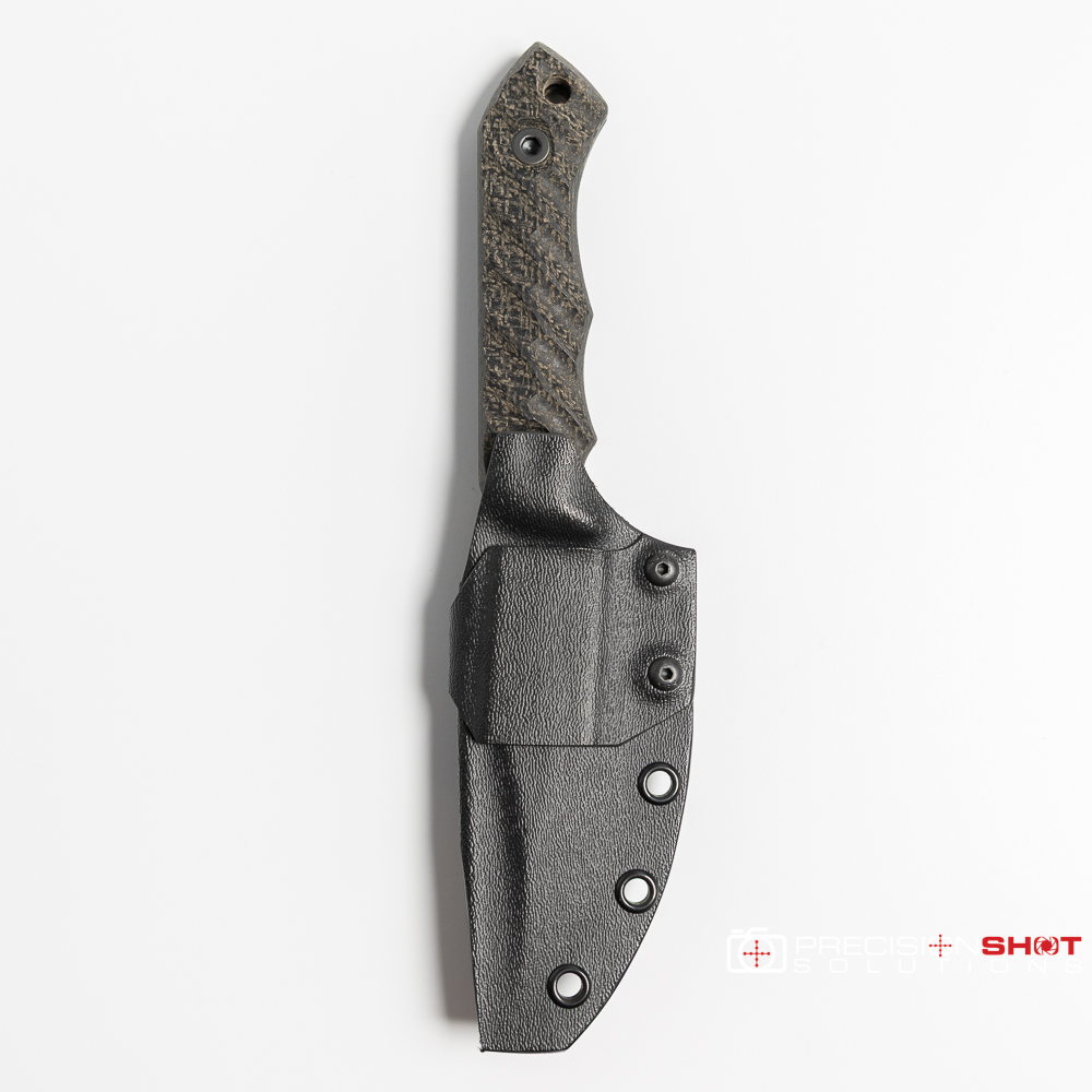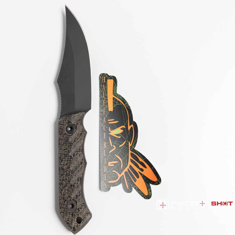 Half Face Blades Red Cloud featuring black burlap micarta scales with iron grip, Allen bolts, and armor black Cerakote finish. Comes with black kydex sheath.