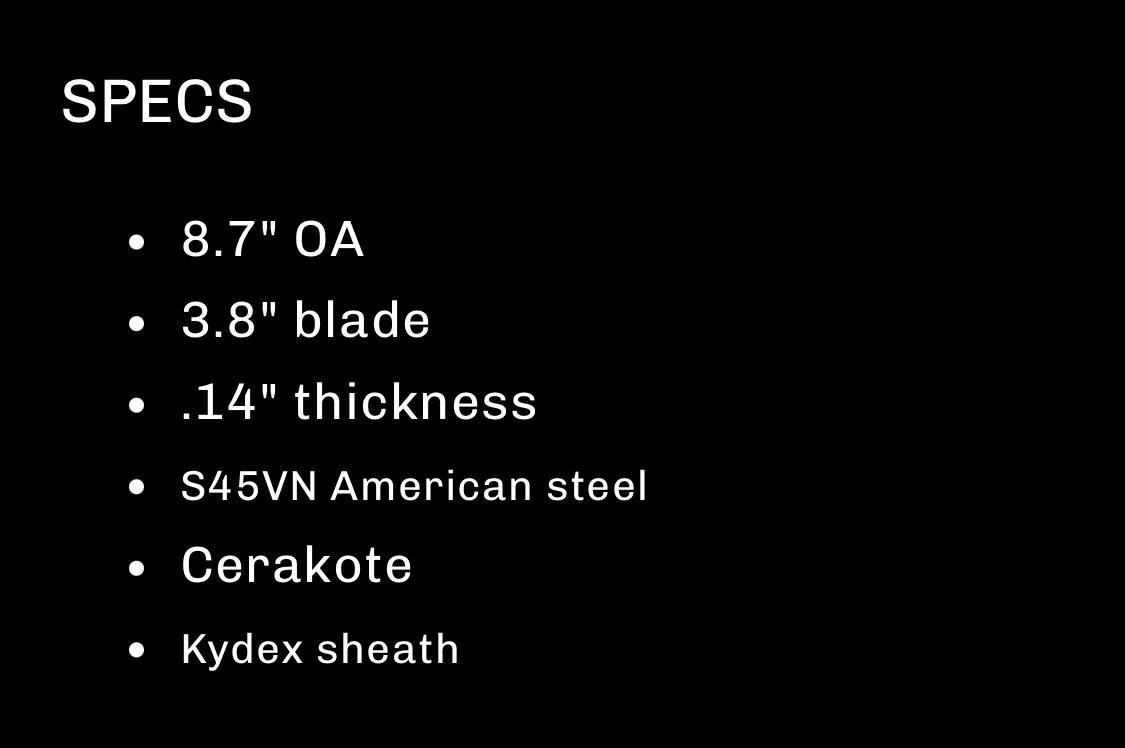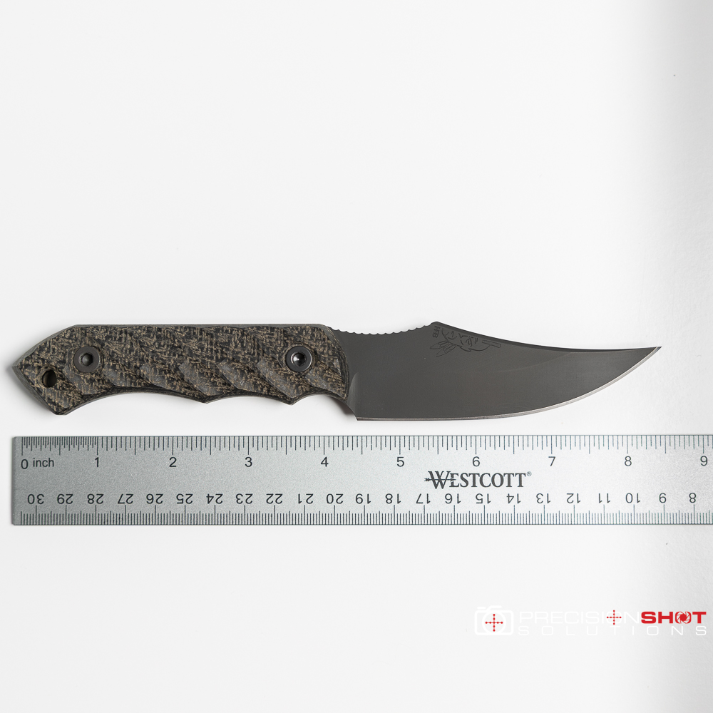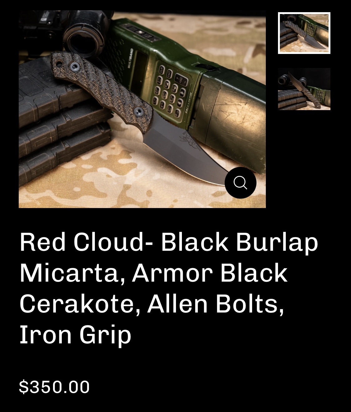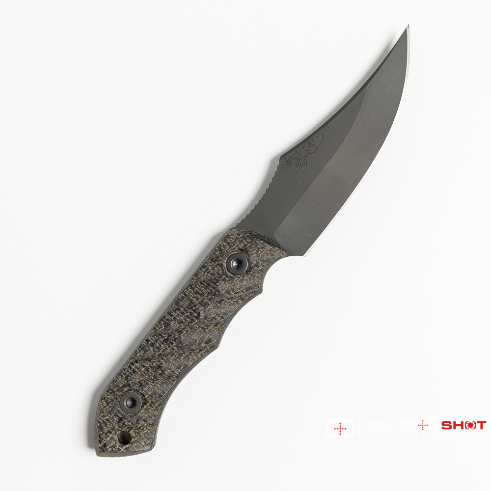 Half Face Blades Red Cloud featuring black burlap micarta scales with iron grip, Allen bolts, and armor black Cerakote finish. Comes with black kydex sheath.