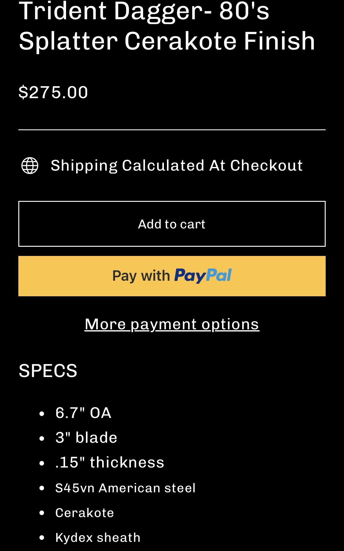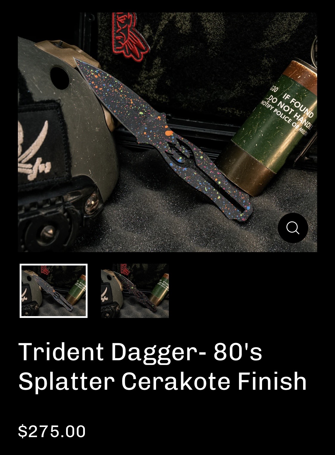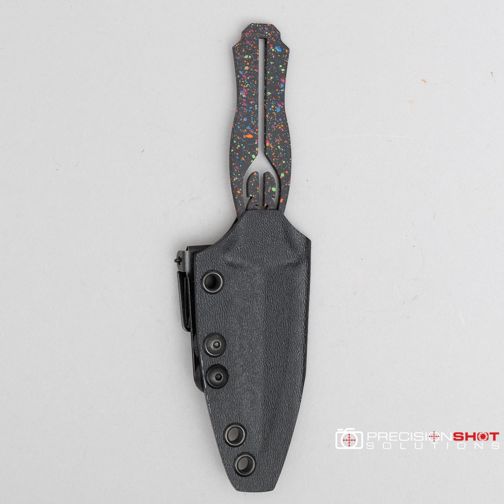 Half Face Blades Trident dagger with 80’s rad splatter Cerakote finish. Comes with black kydex sheath with Ulti-clip.